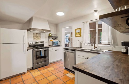 Solana Spanish Villa's, Villa #6, located in the Tanque Verde valley of Tucson’s East side. This private villa offers a spacious 2BR retreat nestled within a historic private estate. Featuring a full well stocked kitchen, large living room with a queen size sofa bed, bonus sunroom, fenced and furnished back patio with BBQ grill. NOTE: Attached master suite casita #7 can be rented/unlocked with this villa which adds room for up to 3 more guests! Please see listing for • Solana #6+7