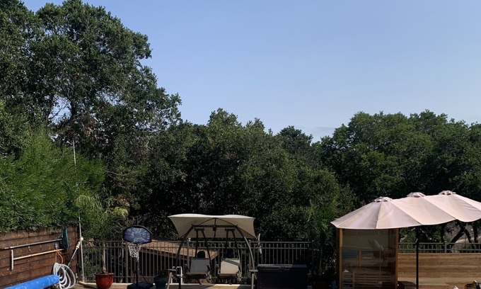 Spacious ground floor studio with King bed, twin bed, full bathroom with shower, dining area, desk, sofa, full kitchen and private enclosed patio with 4 person hot tub. Shared access to large backyard with resort like pool, dry/wet sauna, fire pit, lounge area and games. Plenty of off street parking in a quiet oak studded neighborhood. Located across the highway from world class WeatherTech Raceway Laguna Seca and a short 15 minute drive to Monterey, Carmel, Pacific Grove and Salinas.