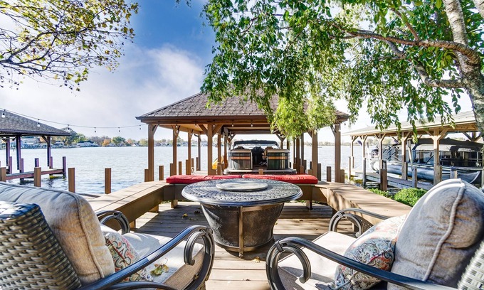 Exterior: Free dock space, firepit, gas grill, deck furniture and loads of seating.