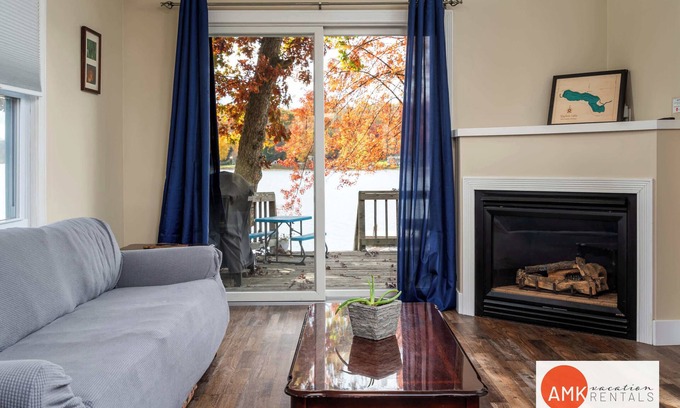 The first bedroom is outfitted with a double-bed and the second bedroom has a set of two twin bunkbeds. Updated kitchen opens up to a cozy living room with gas fireplace. Enjoy stunning lake views, gather around the outdoor firepit for s’mores, or relax by the indoor fireplace on cooler nights.