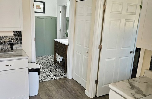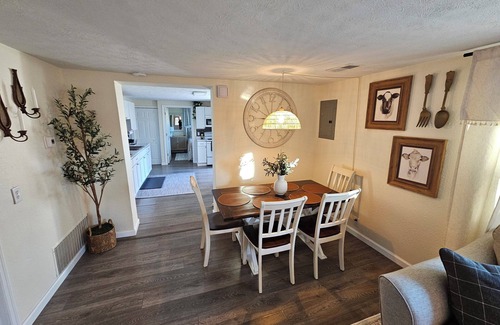 Nestled at the end of a private dirt road, our cozy farmhouse invites you to unwind and relax. The two-bedroom, one- bathroom retreat exudes warmth and comfort, featuring a cozy king bed in the master. The bedroom is thoughtfully equipped with a luggage rack, night stands and closet storage if needed. A second bedroom offers a queen bed, dresser and kids play area. The bathroom has an accessible shower with grab bars. Through the bathroom is a quite private office. The open kitchen and living room space create an inviting atmosphere for gatherings and shared moments. A farmhouse dining table set for 6 is perfect for anything from board games to BBQ. For additional sleeping space, the sofa converts to a queen size bed. Tastefully designed, it's a seamless blend of style and functionality. Adjacent to the master bedroom there’s a laundry room. Whether you're seeking a family getaway or a peaceful solo retreat, this farmhouse is your haven for convenience and relaxation.
