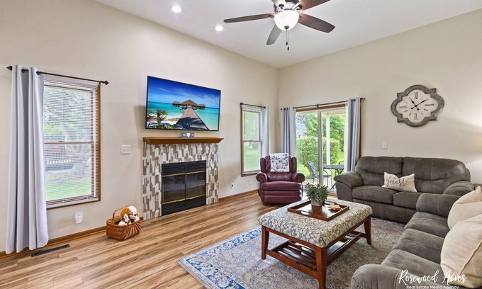 This 3 bedroom two bathroom home has all the Comforts of home. The kitchen has all stainless steel appliances. There is a gas stove & oven with a ice maker in the refrigerator. The open floor plan allows for conversation while Gathering in the kitchen and into the living room. The living room has a 65 inch Smart TV. The patio doors in the living room lead out to a relaxing patio in the backyard. The master bedroom is complete with a king size bed, a 55" smart TV, and a full master bath. The second bedroom has a king size bed and a 48" Smart tv. The third bedroom has a queen bed a48" Smart tv. There is also a deluxe queen air bed located in the bedroom closet which can be blown up in a couple of minutes. There is a full size laundry room with complimentary detergent in the home. You will also enjoy the convenience of an attached 2 car garage for your use. In the garage there are children's and adult bikes for you to enjoy during your visit. We also supply a Pack-in-Play and high chair for the little ones.