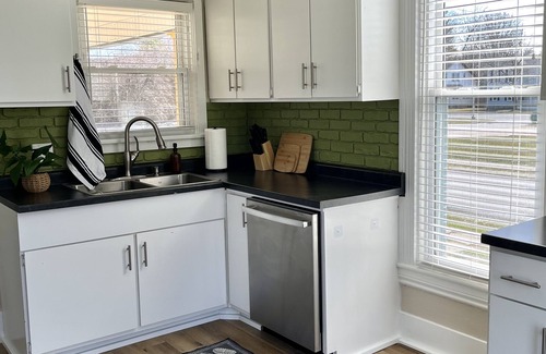 Comfortable and beautifully downstairs unit in the heart of Findlay! Able to sleep up to six people, this lower unit of a duplex is located right off Tiffin Ave. in the middle of town. Large wrap around porch, amazing natural light and comfortable accommodations will make you feel right at home. Two bedrooms and a pull-out couch, one large bathroom, spacious and open living/dining area with a large kitchen. Coffee, Tea, filtered water and general kitchen utensils included. Tesla charger in garage!