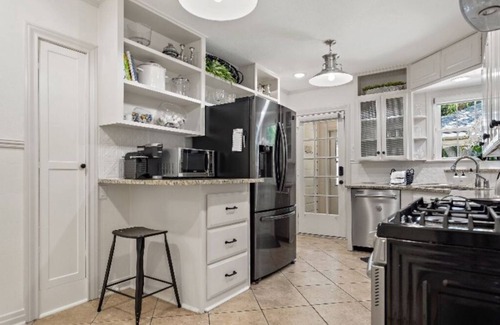 This elegant yet cozy home is a mere half mile or less from the medical/educational hub of Tyler, Texas, in the beautiful Azalea District of historic Tyler. We invite you to come and relax and pamper yourself. The layout of this beautiful home is open and inviting, with two bedrooms downstairs, each with its own desk for working in privacy and a master suite with a private office upstairs. This charming home has been largely renovated and newly furnished for your enjoyment. It includes refinished hardwood floors, new windows, shades and curtains, new furniture, a new washer and dryer, hot water heater, alarm system, a gated backyard, and a new driveway for two cars. This home also has amenities for entertaining, inside and out. They include a Samsung FRAME TV, that seconds as a work of art, and an electric fireplace that gives off heat. We have the accoutrements for entertaining, both for dinner with friends and an evening in the backyard. A new gazebo with a fan and electric capacity, which houses a fire pit and 6 Adirondack chairs, and an outdoor dining table for six and new barbecue nearby will provide all you need. Fresh, colorful landscaping creates the setting for a memorable experience!