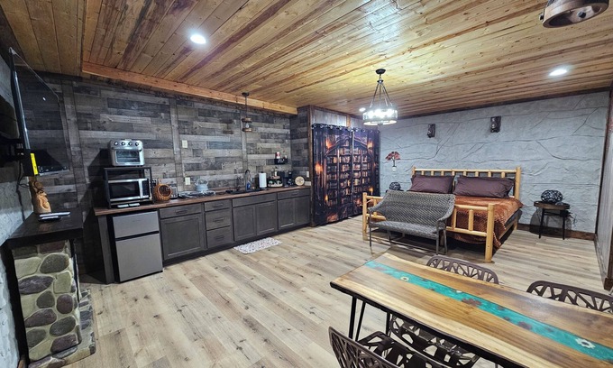 Restin' Holes is a Kentucky village on the Bourbon Trail. This Unit (D) is 1 of the 4 cozy, underground units on the property. This 572 sqft getaway features a king bed, Roku tvs, WiFi, fireplace, kitchenette, dining area, outdoor grill, desk, queen bunks room, washer/dryer, and walk-in shower bathroom. Many shared amenities including: swimspa hot tub, firepit/swings, sauna, gym, waterfall, painted murals, garden, fresh eggs, playground, & outdoor movies.