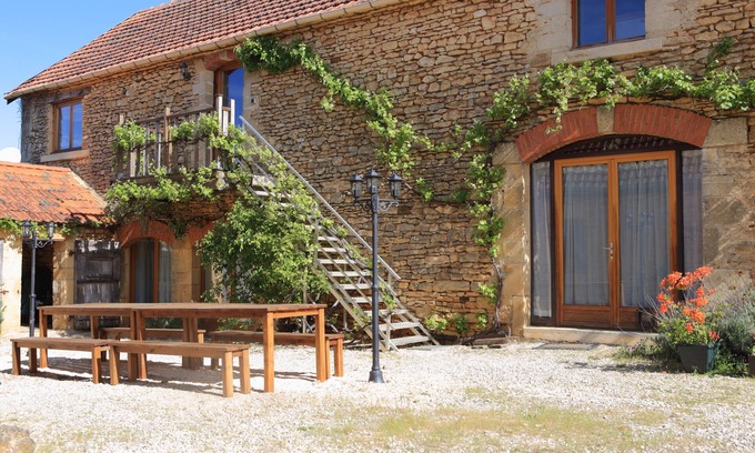 This patiently restored authentic Périgord farm hosts up to 10 guests in 4 large bedrooms, each with private bathroom. Huge living room with exposed oak beams, satellite TV, internet access, books, games and hi-fi. The kitchen, also spacious, is fully equipped: large oven, cooker, microwave, refrigerator, freezer and dishwasher. There is a washing machine and a dryer in the laundry room.