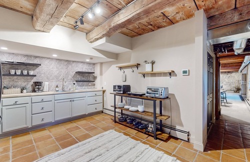 This private oasis boasts a large private patio with outdoor dining that overlooks stunning grounds and a seasonal outdoor pool where you can cool down during the warm months. As you step inside, you will discover a rustic interior with stone walls and wooden accents throughout. The living room invites you to spread out comfortably on an extensive sofa and stream your favorite series and movies on the smart TV. When mealtime comes, prepare tasty treats for the crew in the modern, well-equipped kitchenette with a full-size fridge and a microwave. Additional perks include free WiFi and central AC.