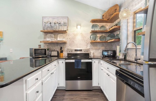 Step into this stunning home and you'll feel instantly welcomed by its modern and bright interiors. The comfortable seating invites you to sit back and relax after a long day out or enjoy an evening in with your favorite movies on the large-screen smart TV. And when it's time to enjoy a home-cooked meal, you'll have plenty of space to gather with your loved ones around the formal dining table that seats up to 7. Additional barstool seating along the counter is perfect for casual dining and snacks. You'll love spending time in the spacious kitchen with its wide countertops, stainless steel appliances, and beautiful open shelving. The high-end homeware adds a touch of refinement to this functional yet inviting space!