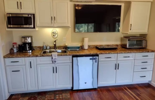 Main entrance is into the living area that has a fully equipped kitchenette with microwave, sm. fridge, coffee maker, lg. toaster oven, and a 2-burner electric unit. The kitchenette is fully stocked and outside is a gas BBQ that can easily be used for cooking and grilling. Above the cabinet in the kitchenette is a lg. 55" Smart TV. Off the kitchenette is a second bathroom and laundry area.