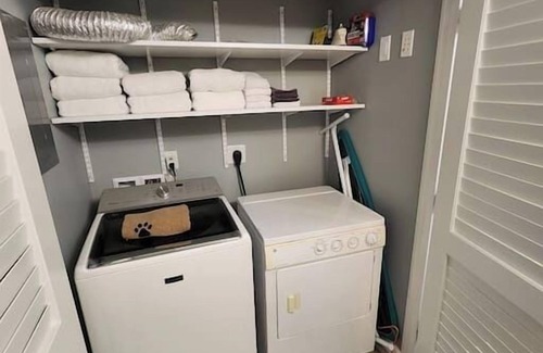 There is one bedroom, with a queen bed, and one bathroom with a washer/dryer to do your laundry. The kitchen has stainless steel appliances and quartz countertops. It is fully functional with blender, drip & k-cup coffee maker, pans, skillets, baking sheets, and cooking utensils. There are also dishes, glasses, and silverware available to use during your stay. The living area has a smart TV for your viewing pleasure.