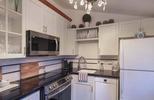 The downstairs bedroom has a beautiful queen size bed also clothed in crisp, clean linens. Just down the hall is the 2nd bath. Luxurious with its inviting, deep soaking bathtub with spray attachment. Both baths have been redone with vintage style tile floors giving them a bright, clean feel upon entering.