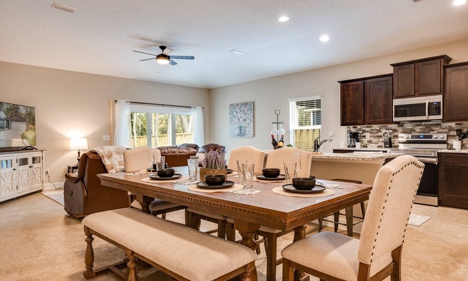 We are located in Fleming Island, FL which is Southwest of Jacksonville and about 40 minutes from Jacksonville International Airport. This is a brand new construction - great for families or a small group of friends traveling together. Great open concept kitchen/dining/living area with sliding doors that open to the fenced back yard. The dining area features seating for all 6 guests and is just off of the kitchen. Unwind in the cozy living room at the end of your day of fun - and enjoy your favorite programs on the SMART TV. Don't forget to bring your login information for your Hulu, Netflix, or Amazon Prime Accounts or watch any of the FREE Apps available! There is a lot of shopping & restaurants nearby, we are just behind the famous Corky Bell's Restaurant. Doctor's Lake Marina is 10 minutes away.