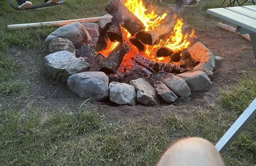 Escape to our small charming cabin, situated in a secluded retreat with a queen-sized bed and hideabed. Explore walking trails, lakes, and fishing spots in the vicinity. Take a scenic drive to Glacier Park, just an hour away, or set up a tent outside the cabin and enjoy quality time with family around the fire pit. Glistening solar string lights illuminate the night, accompanied by an outdoor shower and wash basin for refreshing morning and evening routines.