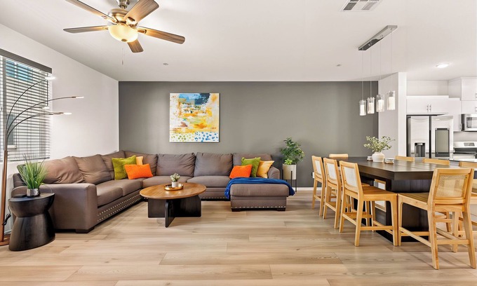 The open floor plan leads from the kitchen and dining area into the spacious living room, making it easy to enjoy quality family time no matter which room you’re in. Sink into the plush sectional sofa and relax before another exciting outing in San Diego.