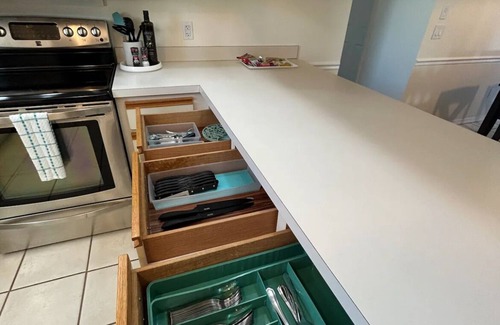 Fully equipped with cooking basics, refrigerator, microwave, stove/oven, dishwasher, blender, toaster, coffee maker, complimentary variety tea & coffee pods, dishware & flatware.