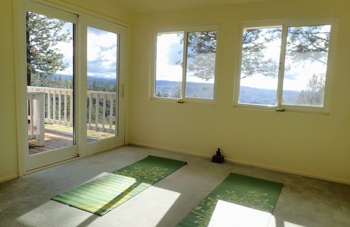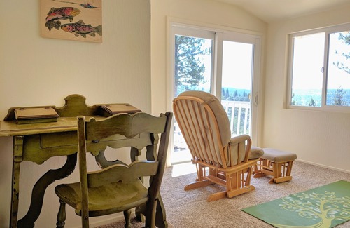 There are three levels. The main level has the wrap-around deck and views, kitchen, fireplace, living room, master bedroom, twin-bed bedroom, and two bathrooms. One of the bathrooms is shared between the twin-bed bedroom and the bedroom upstairs, which has the best view but can be colder in the winter and warmer in the summer. A space heater and many blankets are provided.