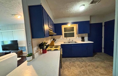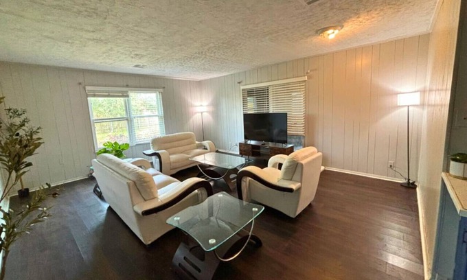 Step into a peaceful vintage-inspired getaway nestled in one of Northwest Houston’s quiet residential neighborhoods. This private 1-bedroom, 1-bath retreat offers the perfect balance of nostalgic charm and modern comfort. Ideal for solo travelers, couples, or business guests, the home features a cozy queen-size bed, sleek white leather furniture, and a smart TV for all your streaming needs.
