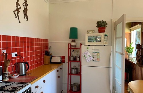 One of the original Pambula beach houses it offers prime location on the beach road, just three minutes walk from where the river meets the sea. Lovingly refurbished in mid-century style, the house has ocean views from the balcony and both picture windows (lounge room and sun room) The open fireplace will have you snugged up for lounge room whale watching (July to November), the balcony will have you lazing in the sun, wondering if you should amble to the beach or make a G & T. A great selection of cooking books are provided along with an extensive range of novels for both adults and children.