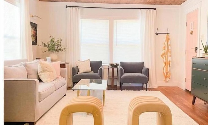 With the exception of the original shiplap walls & floors, everything is new in this 1950’s bungalow. Each item has been hand selected for your comfort, convenience & enjoyment. The primary bedroom includes a luxury mattress & layered bedding, and a walk-in closet . The second bedroom has two full sized beds, a desk & closet. The kitchen is fully stocked for making a home cooked meal, and the private backyard provides a safe space for pets and kiddos to run around.