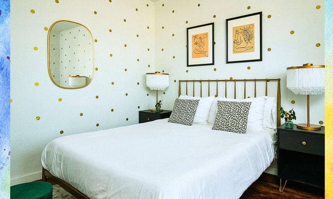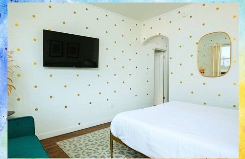 This cozy studio offers a warm and inviting space perfect for 1-2 guests. With a comfy bed, plenty of natural light, WiFi, and AC, you’ll have all the essentials for a relaxed and comfortable stay. The studio features charming touches like gold polka dots, adding personality without overwhelming the space.
