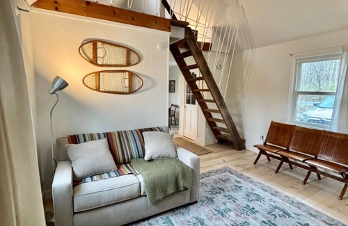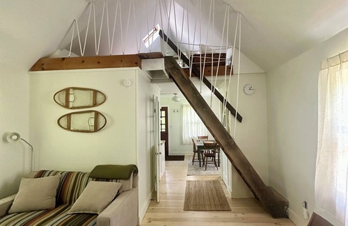 The cozy bedroom includes a skylight so you can fall asleep under the stars and wake up to fresh country air. Cook with ease using stainless steel Cuisinart cookware and enjoy a farm-fresh meal on the front porch surrounded by birdsong and old-growth trees.