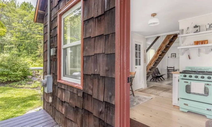 Luxury meets rustic charm in this thoughtfully designed wood-shingled cottage for two. Tucked into the countryside, this tiny home features wide-plank pickled wood floors, teal retro appliances, a classic clawfoot tub, and a lofted bedroom up reclaimed wood stairs. The two-floor living room with a pitched ceiling and exposed beams creates an airy, open feeling, soaked in soft natural light and cooled by a steady cross breeze that invites the outdoors in.