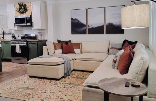 Open to the kitchen is the living room and large cozy sectional with enough room for the whole family to cuddle up for a movie night. The sectional can also be positioned to comfortably sleep 2 additional guests.