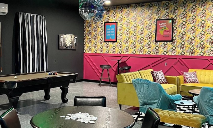 Welcome to our retro groovy game room - the ultimate hangout spot for all your entertainment needs! This is perfect for a group of friends or family looking to have some fun and relax in a cool and funky environment.