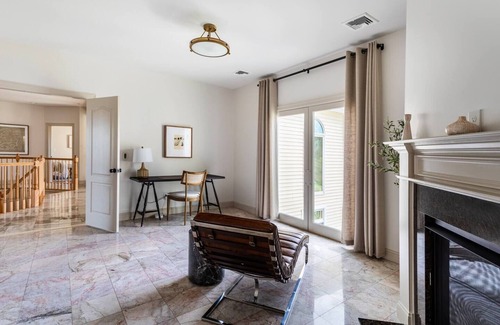 The first floor is complete with a kitchen with luxury Viking appliances, a breakfast table, a dining room fit for 20, a lounge with pool table & wet bar just off the great room with foosball table. The stunning Great Room with 40 foot ceilings is drenched in sunlight and the 85 inch television is perfect for family movie nights and games. Two bedrooms, one king and the other with two queen beds - each with ensuite bathrooms complete the lower level. Upstairs the magic continues with 4 more bedrooms on one wing (2 King, 1 Queen and one room with two bunk beds) - each with ensuite bathrooms, a library bathed in sunlight and the ultra luxe master suite and adjoining sitting room. If that weren't enough, Rhinebrook Estate caters to fitness and health minded people with our yoga and fitness studio, 5 person indoor sauna and massage room. Everyone can enjoy ensuite bathrooms for each guest as well as desks and chairs in each room ideal for remote work for those escaping the city. Also included are 2 Speed Queen washer dryer sets, 2 Bosch dishwashers, 72 inch Viking fridge/freezer set, 36 inch 6 stove Viking Range and plenty of pantry space.