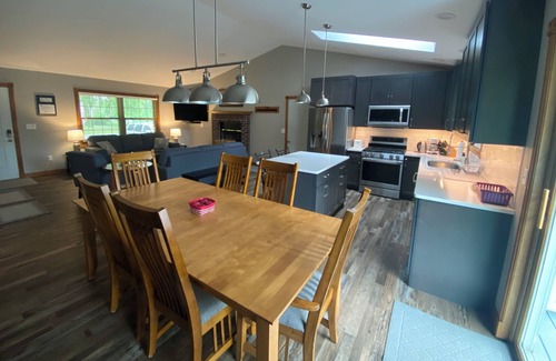 The recently updated open concept kitchen on the main floor features a gas stove, granite countertops, and island. It opens up to a large dining table and living space with television. On this same floor are three bedrooms and two full bathrooms. The lower living space offers a large living space where everyone can gather and watch a game or movie on the 85” television screen. There are two more bedrooms on this level, one with a queen bed and another with three extra-long bunk beds for six people. Another bathroom and the laundry room are also on this lower level.