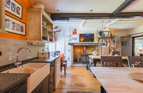 Kitchen with Aga, American style fridge/freezer, butler sink, wood burner, dishwasher, large breakfast table and chairs