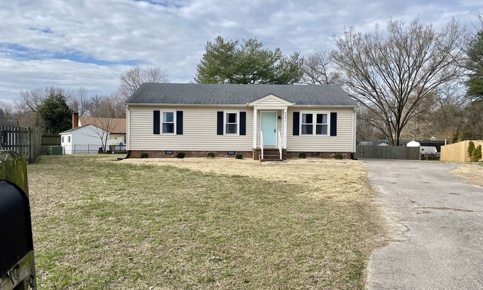 Relax with the whole family at this peaceful one-story home. Home was just renovated with guests in mind. Accommodates up to 6 with three bedrooms each with queen beds. The Primary bedroom has a private attached bath with a ceramic walk-in shower. Eat-in kitchen ready to cook in. Living area with a 50-Inch Smart TV. Renovated Hall bath with a tub. Washer/dryer provided. Great location less than a mile to I295. Minted to Richmond Speedway, Bon secours hospital and 20 minutes to Meadow Event Park/Kings Dominion, and 40 minutes to Williamsburg.