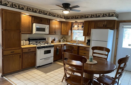 Full size kitchen with propane stove and refrigerator. Washer and dryer in the bathroom. Bathroom features a tub.