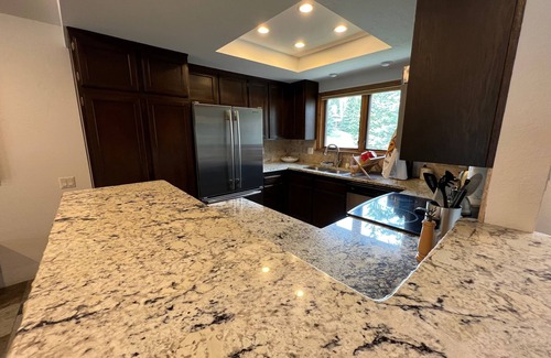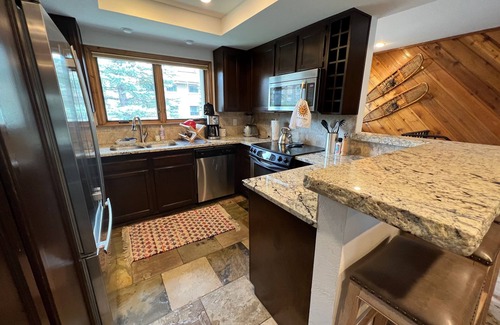 Ridge Condo 2601 has been newly renovated and updated with your Sun Valley mountain retreat in mind. The living area is open plan and beautifully appointed with warm wood flooring, a river rock fireplace, alpine inspired interiors, and cozy spaces to relax and unwind. The sofa converts to a sleeper for 2 guests. The kitchen is fully-equipped with modern stainless appliances and kitchen essentials, granite counters, and a breakfast bar. The dining table will seat all your guests with extra seating for 3 at the breakfast bar. If you need to work remotely from the mountains, there's a desk to set up your laptop during your stay. Looking for a little luxury - in the winter months, the slate floors are heated!