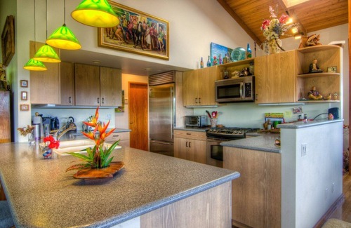 This 3,000 square foot home is a comfort zone in and out. Upstairs highlights include high ceilings, a spacious kitchen with wrapping granite countertops, an elegant dining area and a roomy living area. The master suite has a king bed, a spacious lanai and a charming Hawaiian chic decor. Downstairs, one bedroom features a king bed, the other has one double bed, and both have private baths and direct access to the pool and open lanai perfectly suited for a day (or days) of leisure.