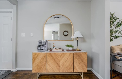 The private wing of the house features a full bathroom and three serene and comfortable bedrooms with blackout curtains, supportive mattresses, luxurious linens, warm blankets, plush pillows, and a laptop desk. The primary bedroom boasts a king-size bed, smart TV, large walk-in closet, and a second en-suite bathroom with a large shower. Both bathrooms are thoughtfully stocked with soft towels and washcloths and complimentary shampoo, conditioner, body soap, razors, and lotion, to elevate your stay and help you feel at home.