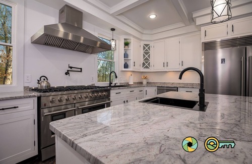 The open kitchen features a mesmerizing coffered ceiling, hand-crafted white shaker cabinets, a large island, and captivating granite countertops. Amateur and professional chefs alike will enjoy cooking with the large eight-burner gas range and double ovens. Prep and clean up is easy with two separate sinks and an over-range pot filler. The huge commercial-grade fridge & freezer provides ample storage for your feast fixin's - you'll wish you could stay longer! Dining options include a seven-person farm table, and seating for four at the island. The kitchen is stocked with basic cookware, tableware, high-end everything, a drip coffee maker (filters provided, but please bring your favorite grind), and a Kuerig machine.
