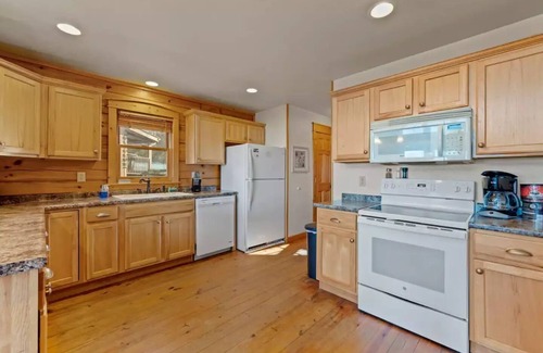 Large fridge, Electric stove, dishwasher, microwave, coffee maker, toaster, and ice maker. The dining room table seats up to 6 and the kitchen bar seats 2. Fully stocked with all cooking utensils, pots, pans, strainers, plates, bowls, glasses, and pretty much anything you would need to make a full meal to enjoy!