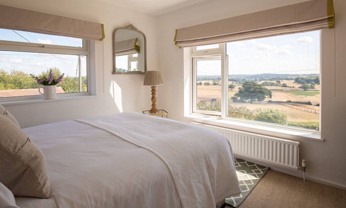 Ridgeway Farmhouse sits within a large wraparound garden. Roses border the front wall along with a large blackberry bush, which come autumn is laden with luscious dark fruit, just ripe for picking or perhaps turning into a pie! Meandering around the side, you'll find two Adirondack chairs perfectly placed so you can lounge in the sunshine, G&T in hand watching the birds of prey soar overhead, and then to the rear, a large lawn where a cantilevered parasol casts shade over the outside dining table and chairs, and a wood-fired hot tub where you can relax in the warm water and soak in the view to your hearts' content.
