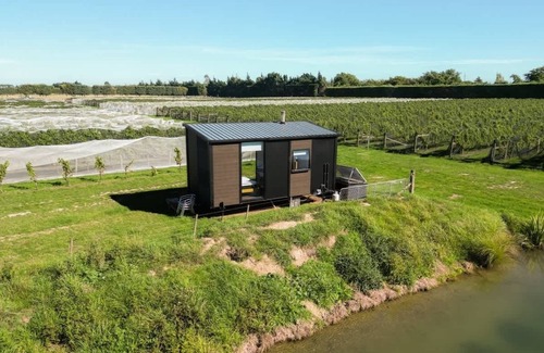Riesling Cabin by Tiny Away is located in the serene rural landscape of Burnham - South Island New Zealand, just 30 minutes from the vibrant Christchurch. Surrounded by rows of lush vines, it offers a tranquil retreat, where the gentle rustle of leaves and the soothing scent of grapes infuse the air with a sense of rustic charm and tranquility.