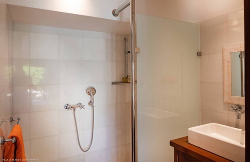 The villa’s striking living room spans most of the ocean-facing frontage and the magnificent view is framed by towering coconut trees. In the rear, a delightful courtyard-like terrace features a fountain, a Jacuzzi (for 10) a wet bar and a dining table. The panorama from this vantage point is also spectacular, and come evening, the dramatic lighting is magical. Perfect for a party! The kitchen is equipped to meet the needs of a professional chef, so it is sure to thrill foodies who enjoy cooking-in. Additionally, there is a poolside gas BBQ grill. There are five luxurious air-conditioned bedrooms (French-king beds) in the main house, all have spacious and sumptuous en suite baths complete with fluffy robes, dressing areas, private terraces and the sound of the surf.