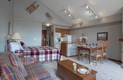 RIMFIRE 406; 1 BEDROOM STUDIO, 1 BATH - BEDDING: QUEEN AND QUEEN SLEEPER SOFA. - This top-floor studio condo with cathedral ceilings, western views, and lots of light. Features a full kitchen with accessories and a gas fireplace. Quiet, relaxing, and roomy. Rimfire is the perfect location for your vacation. Right in the heart of The Village, close to all the action. Enjoy a fresh cup of coffee at Starbucks, dine in one of our fine restaurants, relax in one of the hot tubs located in the complex, or walk to any of the shops, and restaurants.