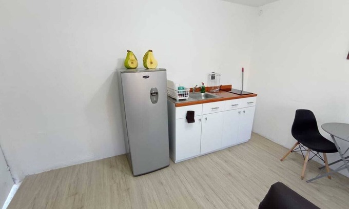 Pequeño Mini departamento, con entrada directa en planta baja, No cuenta con estacionamiento, Solo en la calle que es tranquila, contamos con cámaras exteriores, No se permiten fiestas ni reuniones, No se Permiten mascotas, cuenta con WIFI, Cama matrimonial, cocina , televisión,Max y Otras apps .