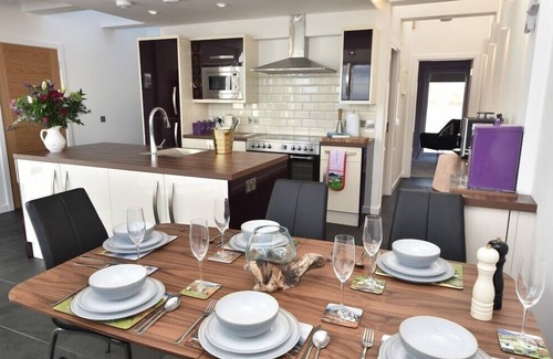 Amenities: Air source underfloor heating with woodburning stove and electric heating on first-floor. Electric oven, electric hob, microwave, fridge, freezer, washing machine, tumble dryer, dishwasher, coffee maker, blender, Denby tableware. TV, WiFi, soundbar, selection of books. Fuel, power and starter pack for woodburning stove inc. in rent. Bed linen and towels inc. in rent. Highchair and travel cot available on request. Off-road parking for 2 cars. Enclosed garden with furniture, hot tub, turf. Sorry, no pets and no smoking. Shop 9 miles, pub 8.4 miles. Note: Bring own linen for travel cot. Note: The bed in bedroom 1 is a king-size zip-link as standard, if you require this to be a twin, please contact us to advise