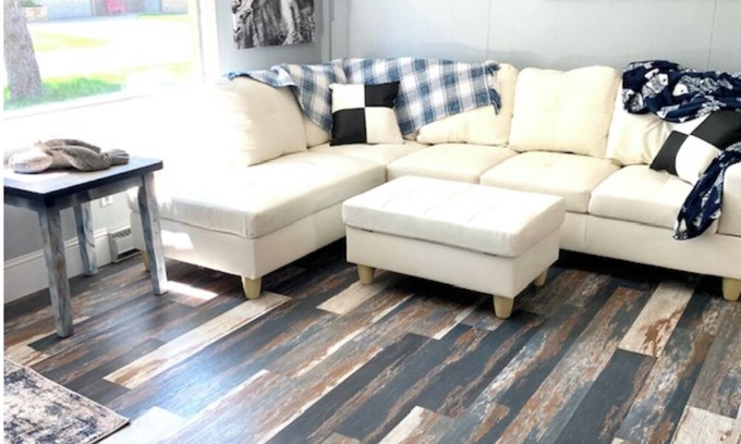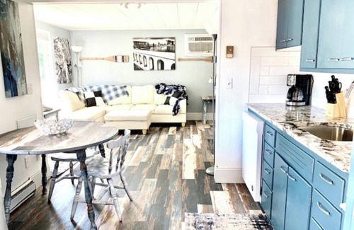 The Stone Crab is one of the crowd favorites at the Ritchie Village. A modern blue, white and grey distressed luxury vinyl plank flooring, granite countertops and a sea theme give guests a feeling of a Cape Cod hideaway. Blue and white modern cabinetry, a white sectional couch and custom wood furnishings contribute to the sea-side theme.