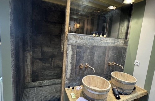 One with an Italian shower, 2 sinks, WC, as well as a bathtub and a television.