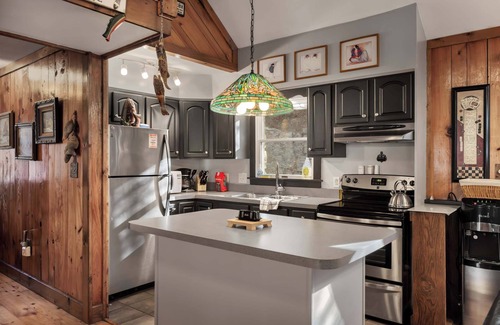 Stone Cabin Hideout is designed for relaxation and comfort. The 2 story open-concept living area is filled with natural light, a cozy stone fireplace - perfect for chilly mountain nights, a loft above, and dining area with ample seating for everyone to gather and relax. A fully equipped kitchen with modern appliances and plenty of space for cooking meals together. Outside you’ll find a large deck spanning the length of the cabin - great for relaxing with a glass of wine, enjoying yard activities or taking in the views. The loft balcony is a great spot to enjoy your morning coffee