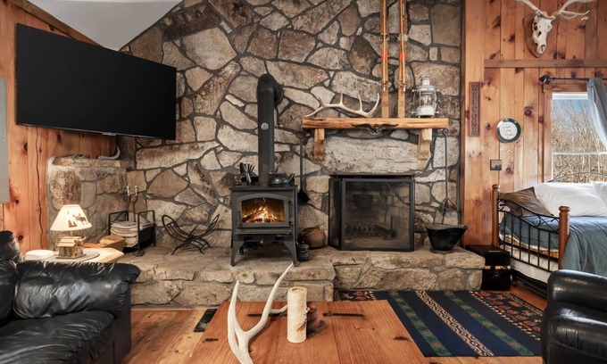 Stone Cabin Hideout tucked away in the rolling hills of Great Cacapon offers a unique mountain getaway with a perfect blend of rustic charm and modern comforts. The cabin's open, airy layout and a grand stone fireplace combines the warmth of natural wood and stone with modern amenities while the wide windows frame the stunning mountain views.