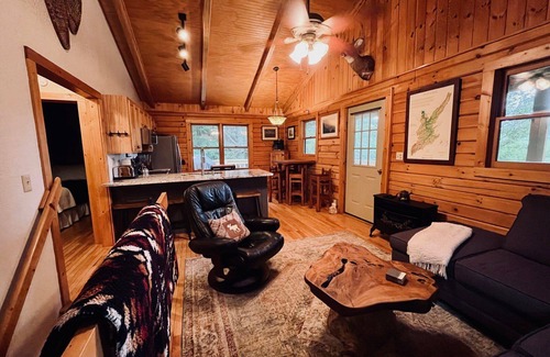 This retreat sleeps 6 total, with the addition of two more bedrooms on the upper level, each with a queen bed and a full bathroom to share, with a tub/shower combination. This upper level features a family room with rustic charm, comfy furnishings, a gas-burning fireplace and scenic views from every angle. The kitchen is beautifully equipped with microwave, dishwasher, coffeemaker, blender, crock pot, and all the dining accessories you might need. The kitchen conveniently opens to the covered porch for outdoor grilling and dining.