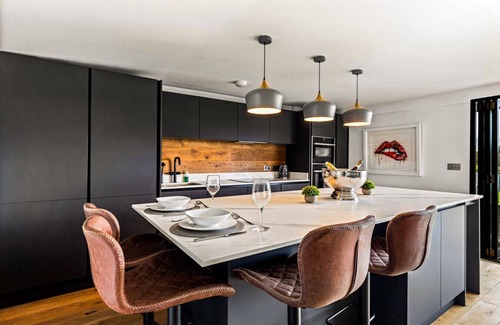 The open plan kitchen/lounge area features a wood burner making the lounge a perfect spot to cosy up day or night.